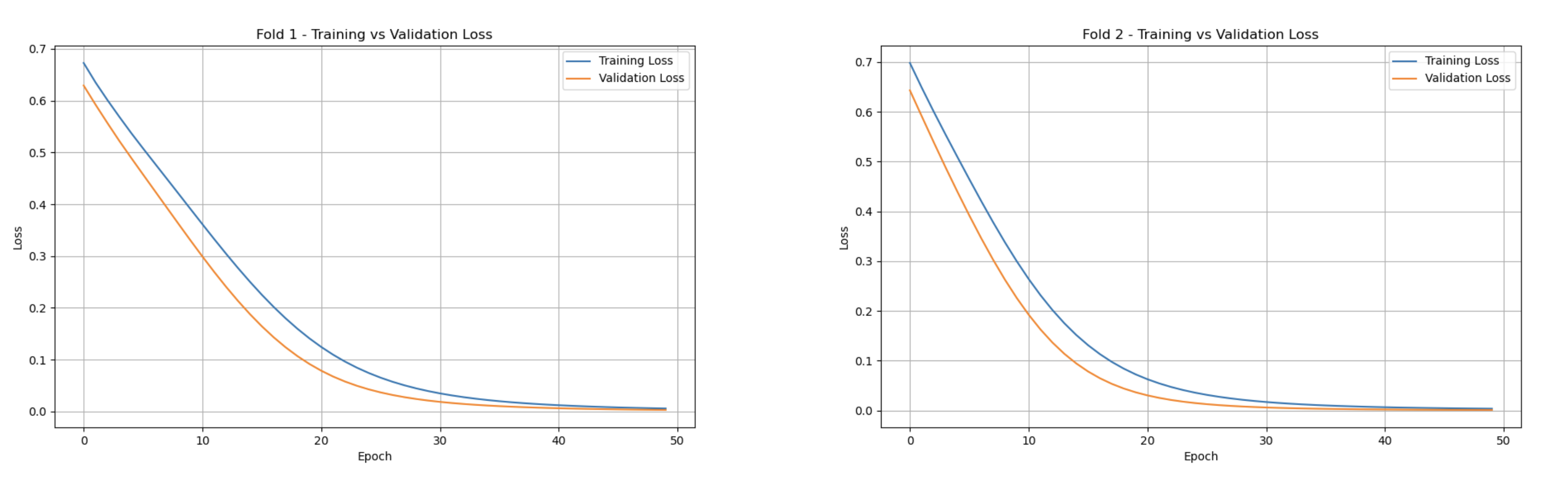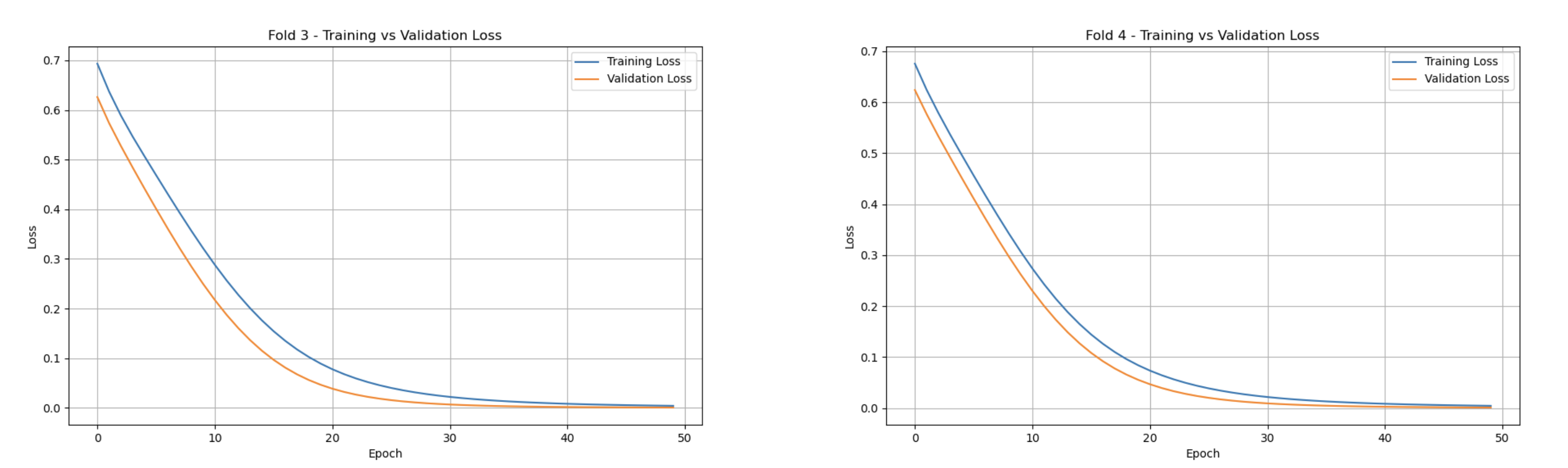 The Training vs Validation Loss graphs showcase the model’s learning progression across each k-th fold. In every fold, the training loss steadily decreases, stabilizing near zero. Correspondingly, the validation loss follows a similar trend, converging towards zero. One key detail is observed within the fifth fold, where the validation loss is slightly higher than the training set, with a larger gap compared to previous folds. This outlier could suggest an under-representative training set for fold five. Nonetheless, both metrics eventually stabilize like the other folds.