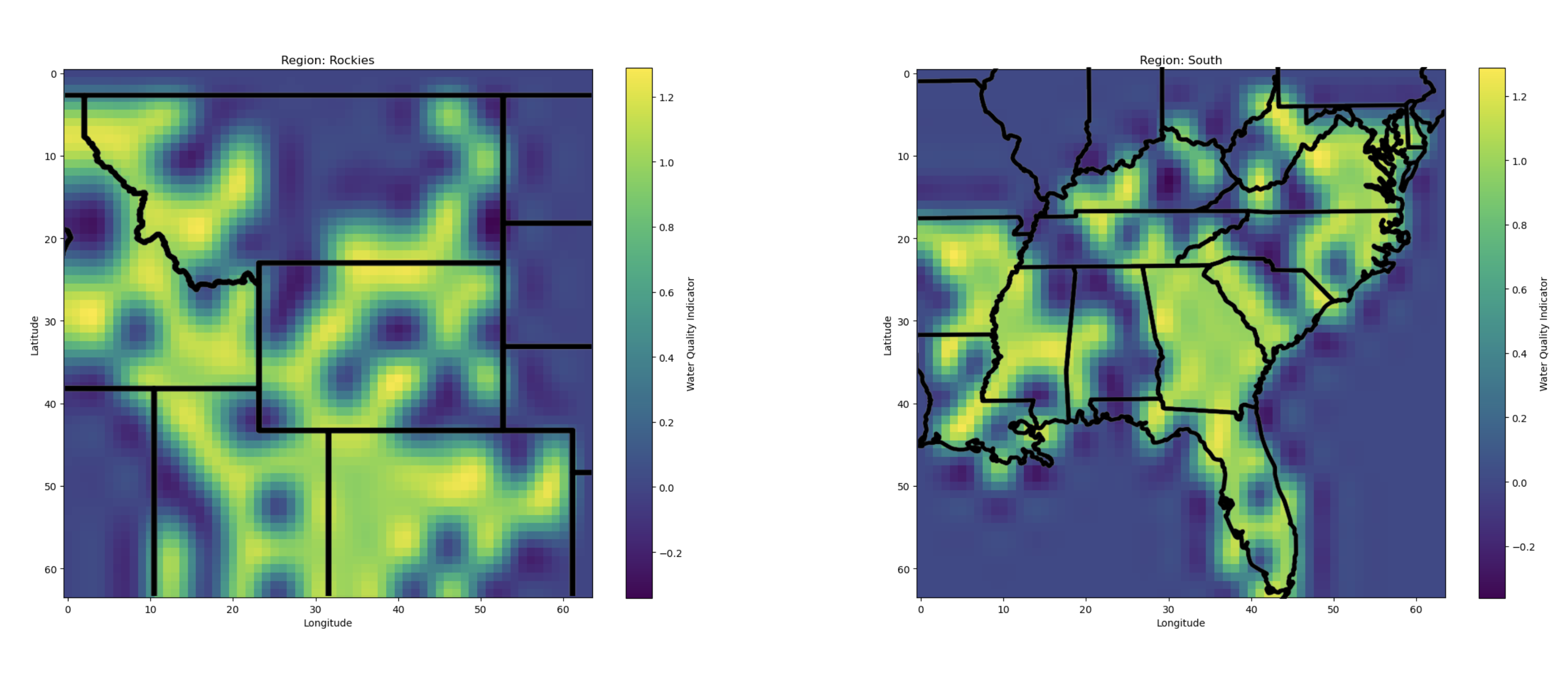 To further illustrate the locality of unsafe water sources, heatmaps were generated. Each region’s map highlights hotspots indicating where the model labeled water sources as unsafe (values close to 1).