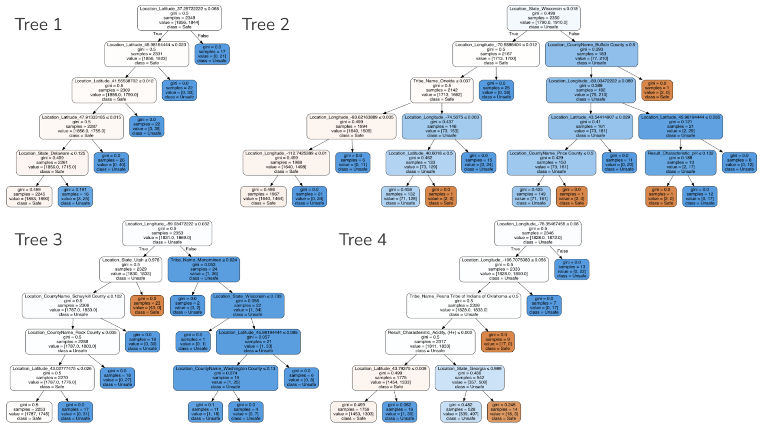 Labeling the tribal name for each data was also a difficult task. At the beginning, we decided to label them based on state and county. However, given the time constraint, in the end we decided to label them sole based on longitude and latitude. We are able to find a dataset from BIA[5] that includes registered tribes and their locations (latitude/longitude), and proceed to map each tribe to the nearest location in our dataset based on latitude and longitude with geopandas. When we trained our model the first time, the feature gain for tribal names was pretty low because of how many tribes there are. Therefore, we revised the way we assign the tribes by only remaining the top 2 most populated tribes for each state in the location csv and assign those tribes to our water quality dataset based on that. We do realize that this is not especially a great way to represent the corresponding native american tribe, and will be discussing potential revision in our next step section.